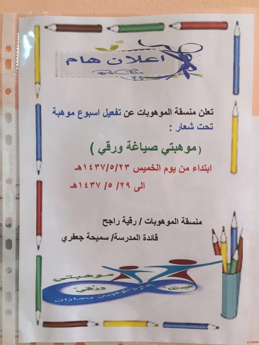 فعاليات أسبوع الموهبة لعام 1437هـ بعنوان موهبتي صياغة ورقي.