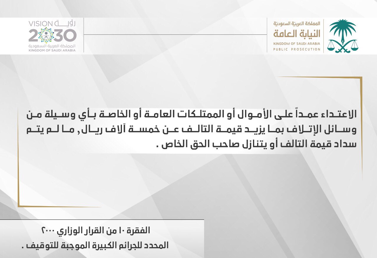 ا لـ ـنـ ـيـ ـا بـ ـة ا لـ ـعـ ـا مـ ـة On Twitter النيابة العامة الاعتداء عمدا على الأموال أو الممتلكات العامة كالطرق أو المراكز الخدمية أو الحدائق العامة والمنتزهات بأي وسيلة من وسائل